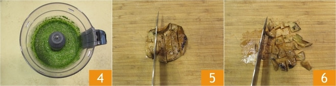 Debes obtener una consistencia cremosa 4. Pon a fuego una olla llena de agua con sal para la cocción de la pasta. Coloca las berenjenas sobre una tabla de cortar y córtalas primero en tiras 5 y luego en cubos de unos 2 cm 6.