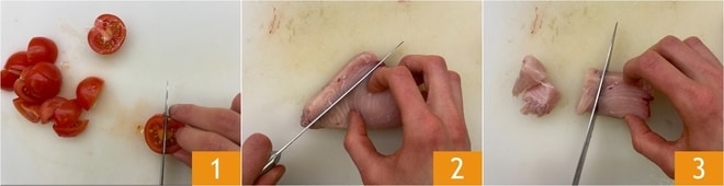 Para preparar la pasta con pez espada, primero poned al fuego una olla de agua con sal que servirá para cocer la pasta. Mientras tanto, lavad los tomatitos y divididlos en cuartos (o por la mitad) 1. Quitad la piel del pez espada y cortadlo primero en rodajas 2 y luego en cubos de aproximadamente 1,5 cm 3.
