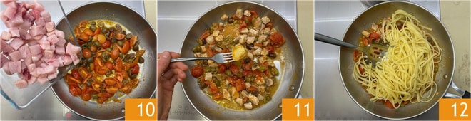 Añadid también el pez espada 10, mezclad bien y continuad cocinando por unos pocos minutos más, luego retirad el ajo 11. Escurrid la pasta al dente y transferidla directamente a la sartén 12.
