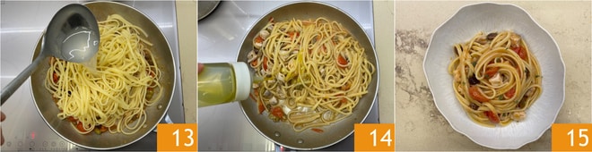 Verted un cucharón de agua de cocción 13 y saltead todo junto para amalgamar. Finalmente, con el fuego apagado, mantecar con un hilo de aceite 14. ¡Vuestra pasta con pez espada está lista para ser servida 15!