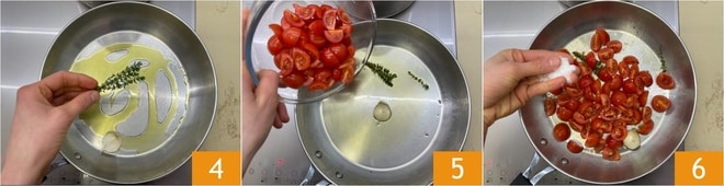 En una sartén grande, calentad el aceite con el diente de ajo y las ramitas de tomillo 4, luego añadid los tomatitos 5. Salpimentad 6.
