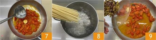 Mojad con un poco de agua para la pasta 7 y coced a fuego medio-alto durante unos minutos. Mientras tanto, sumergid las linguine en el agua hirviendo 8. Mientras la pasta se cuece, añadid las aceitunas a los tomatitos 9.