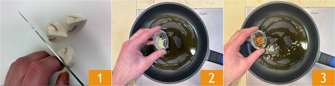 Para preparar la pasta con pollo y champiñones, primero limpia los champiñones y córtalos en cuartos 1. En una sartén antiadherente, vierte el aceite y añade el ajo picado 2 y la guindilla seca 3.