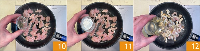 Añade el tomillo 10 y la harina 11. Desglasa con vino blanco 12, deja evaporar todo el alcohol, retira el pollo de la sartén y resérvalo.