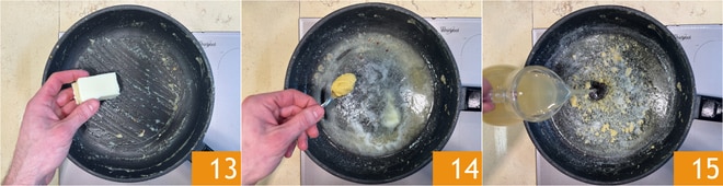 En la misma sartén, pon la mantequilla 13 y déjala derretir a fuego medio-bajo. Añade la mostaza 14 y el caldo de pollo 15.