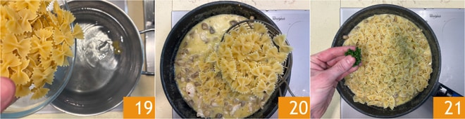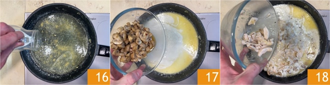 Por último, añade la nata 16 y lleva a ebullición. Añade los champiñones 17 y el pollo 18. Cocina a fuego bajo durante 10 minutos.