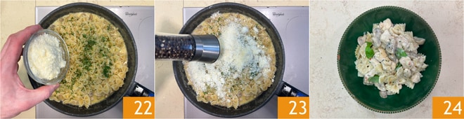 Añade el queso parmesano rallado 22 y una pizca de pimienta 23. Emplata y completa con unas hojas de albahaca. ¡Tu pasta con pollo y champiñones está lista para disfrutarse 24!