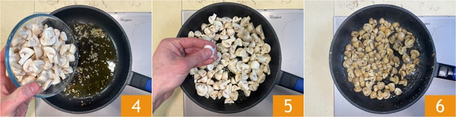 Añade los champiñones 4, ajusta de sal 5 y sofríe a fuego alto durante 10 minutos 6.