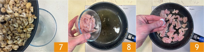 Cuando los champiñones estén listos, retíralos de la sartén y resérvalos 7. En la misma sartén, vierte más aceite, añade el pollo cortado en tiras 8 y ajusta de sal 9.