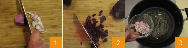 Para preparar la pasta con remolacha y pecorino, lo primero que debes hacer es limpiar y picar con un cuchillo el chalote 1. Corta las remolachas en rodajas y luego en cubitos 2. Pon al fuego una olla llena de agua con sal que se usará para cocinar la pasta. Vierte un chorrito de aceite en una sartén y añade el chalote picado 3.