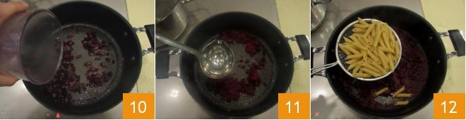 que añadirás al condimento en la cacerola 10. Vierte un cucharón de agua caliente sobre el condimento 11, sala y continúa la cocción del condimento durante un par de minutos a fuego alto. Mientras tanto, cocina la pasta, dejándola un poco menos cocida de unos tres minutos (ajústala según las indicaciones de cocción que encuentres en el paquete). Escurre la pasta directamente en la cacerola con el condimento 12