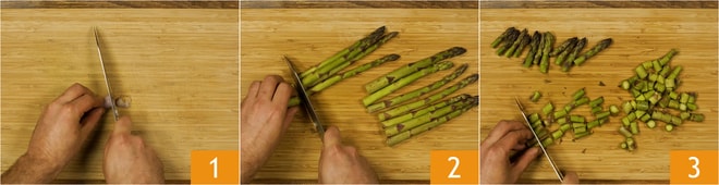 Para preparar la pasta con ricotta y espárragos, primero pelad y cortad finamente la chalota. Ahora limpiad los espárragos; simplemente tenéis que quitar la parte final del tallo, es decir, la más clara y correosa 2. Proceded a cortar los tallos en rodajas bastante gruesas. Recordad cortar solo los tallos y dejad, en cambio, las puntas enteras 3.