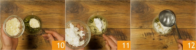 Cuando estén tiernos, transferidlos al contenedor de una batidora de mano. Añadid también el parmesano rallado 10, la ricotta 11 y aproximadamente un cazo de agua caliente 12. Batid todo hasta obtener una crema homogénea.