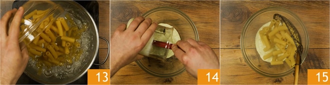 Coced la pasta en abundante agua hirviendo, salada al gusto 13. Transferid la crema de ricotta y espárragos a un bol grande 14. Si resultara demasiado espesa, podéis añadir un chorrito del agua de cocción de la pasta. Escurrid la pasta al dente y añadidla en el bol 15.