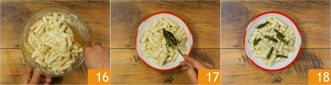 Mezclad bien para condimentar todo a la perfección 16. Solo queda emplatar. Transferid la pasta a los platos, añadid las puntas de espárragos 17, una pizca de pimienta negra y servid 18.