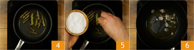 Verted un chorrito de aceite en una sartén, calentadlo y añadid las puntas de los espárragos 4, que se deberán dorar de manera uniforme. Añadid una pizca de sal para dar sabor 5 y dejad cocer durante unos 2 minutos. En otra sartén, calentad otro chorrito de aceite y en cuanto esté caliente, añadid la chalota y dejadla sofreír ligeramente, prestando atención a que no se queme 6.