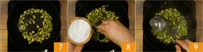 Después de unos instantes, añadid también los tallos de los espárragos 7, dejadlos cocer a fuego moderado añadiendo una buena pizca de sal 8. Cocinad durante unos 10 minutos y, si es necesario, añadid también un cazo de agua caliente 9.