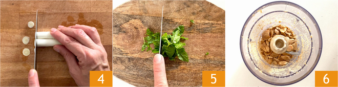 Limpiar los cebolletas y cortarlas finamente 4. Picar la menta 5 y las almendras, para esto puedes usar un procesador de alimentos 6. Finalmente, pon a calentar una olla con agua y sal para cocinar la pasta.