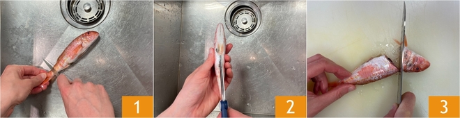 Para preparar la pasta con salmonetes, alcaparras y ajo negro, primero limpia el pescado: escama los salmonetes raspando la piel con el dorso de un cuchillo 1, luego corta las aletas e incide la barriga con unas tijeras 2. Elimina las vísceras y enjuaga bien bajo agua corriente. Ahora coloca los salmonetes sobre una tabla de cortar y corta la cabeza 3.