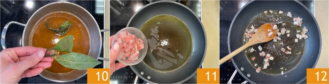Agrega las hojas de laurel 10 y deja cocinar a fuego alto durante unos 30 minutos; el líquido deberá reducirse a un tercio. Mientras tanto, calienta un poco de aceite en una sartén antiadherente, añade los cubos de salmonete 11 y sofríelos a fuego medio durante unos 5 minutos. Una vez dorados 12, retíralos de la sartén y resérvalos.