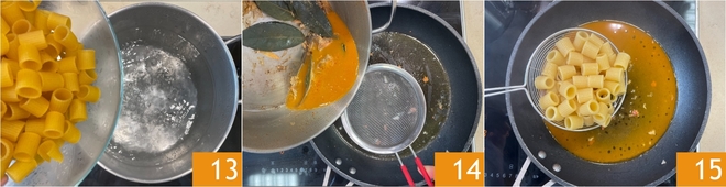 Mientras tanto, lleva a ebullición una olla con agua salada y cuece los rigatoni a la mitad durante 2 minutos menos del tiempo indicado en el paquete 13. En este punto, el caldo estará listo, así que cuélalo en la misma sartén en la que doraste los salmonetes 14. Escurre la pasta y pásala a la sartén con el caldo 15.