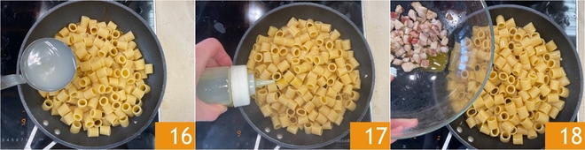 Vierte un cucharón del agua de cocción de la pasta 16 y termina de cocinarla, luego remueve con un poco de aceite 17. Por último, añade los cubos de salmonete dorados 18.