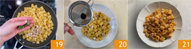 Agrega también las alcaparras desaladas 19 y mezcla todo. Emplata y completa con una pizca de ajo negro en polvo 20. ¡Tu pasta con salmonetes, alcaparras y ajo negro está lista para ser servida 21!