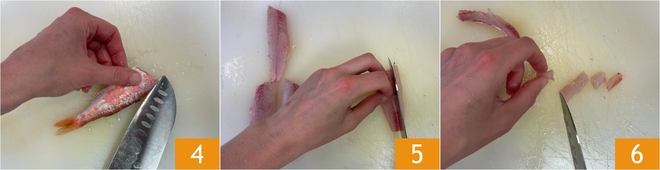 Obtén los filetes 4 y sepáralos de la espina central 5. Elimina las espinas más pequeñas de los filetes, luego córtalos en pequeños cubos 6. Conserva tanto la cabeza como las espinas y guarda los cubos de salmonete en el frigorífico.