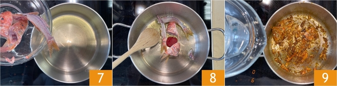 Calienta un poco de aceite en una cacerola, luego añade los restos de los salmonetes 7 y el concentrado de tomate 8. Sofríe bien a fuego alto, mezclando frecuentemente, luego vierte el agua 9 y desglasa el fondo de la cacerola.