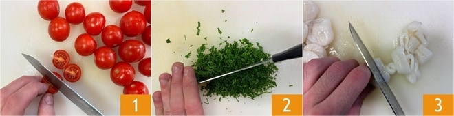 Para preparar la pasta con sepias, comienza lavando y cortando los tomatitos por la mitad 1. Luego pica el perejil después de lavarlo y secarlo 2. Ocúpate luego de las sepias: nosotros hemos utilizado sepias ya limpias, si tienes sepias enteras que eviscerar, puedes seguir las instrucciones para limpiarlas siguiendo nuestra ficha: Cómo limpiar las sepias. Una vez limpias, corta las sepias en rodajas 3.