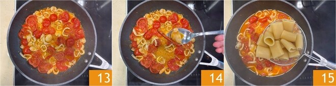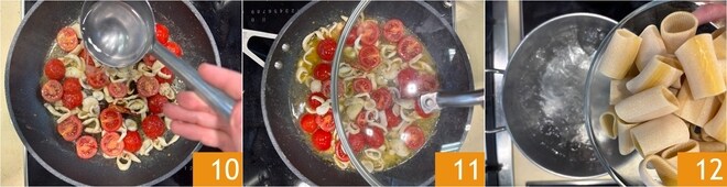 Vierte un cucharón de agua 10, cubre con la tapa 11, y continúa la cocción durante unos 15 minutos, hasta que los tomatitos hayan soltado parte de su jugo. Mientras tanto, cuece los paccheri al dente en abundante agua con sal 12.
