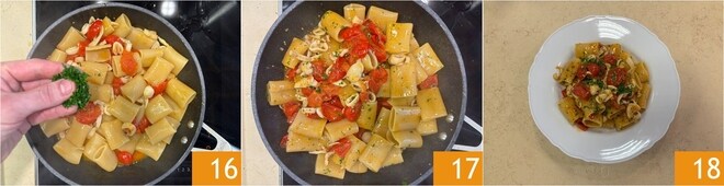 Mezcla bien para amalgamar los sabores, añadiendo si es necesario un poco de agua de cocción para obtener una mayor cremosidad. Completa con el perejil fresco picado 16, mezcla nuevamente y sirve la pasta con sepias bien caliente 18.