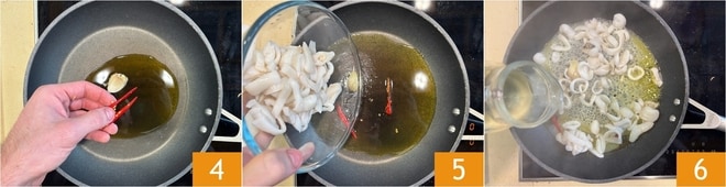 En una sartén grande, calienta un poco de aceite de oliva virgen extra, añade el ajo machacado y dos guindillas 4. Sofríe hasta que el ajo esté dorado, luego añade las sepias 5 y cocínalas durante 3-4 minutos. Vierte el vino blanco 6 y deja que se evapore. Mientras tanto, lleva a ebullición una olla llena de agua que servirás para cocer la pasta.