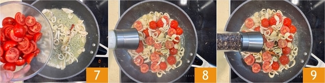 Añade los tomatitos cortados por la mitad 7, ajusta de sal 8 y pimienta 9.