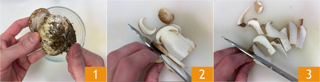 Para preparar la pasta con setas, comienza con la Cómo limpiar los boletus: elimina la parte terrosa del tallo 1, luego retira cualquier otro residuo con un pincel o una servilleta ligeramente humedecida. Corta los boletus en láminas finas a lo largo 2. Haz lo mismo con los cardoncellos y córtalos en rodajas finas 3.