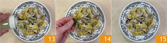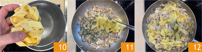 Mientras tanto, lleva a ebullición una olla con agua salada y cocina las pappardelle 10. Escurre la pasta al dente y transfierela a la sartén con las setas 11, luego saltea todo durante un par de minutos 12; si es necesario, puedes añadir un poco de agua de cocción.
