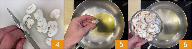 Finalmente limpia y corta también los champiñones 4. En una sartén amplia calienta el aceite con el diente de ajo aplastado 5, luego añade todas las setas 6.