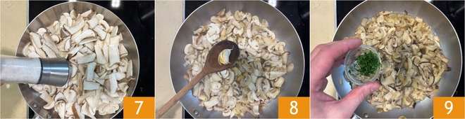 Sala 7 y cocina a fuego medio durante unos 10-12 minutos, removiendo de vez en cuando. Cuando las setas estén bien doradas y toda el agua se haya evaporado, apaga el fuego, elimina el ajo 8 y perfuma con el perejil picado 9.