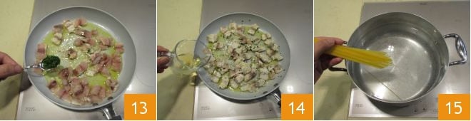 Luego añade el perejil lavado y finamente picado 13. Desglasa con el vino blanco 14 y deja cocinar durante aproximadamente 1 minuto a fuego alto. La caballa ya está lista: resérvala. Mientras tanto, cuece la pasta en abundante agua con sal 15.