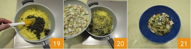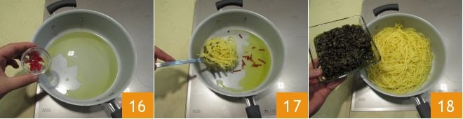 En este punto, toma un chile, quítale las semillas internas y córtalo en tiras. Vierte un chorrito de aceite en otra sartén y añade el chile 16. Cuando la pasta esté al dente, escúrrela directamente en la sartén con el chile 17 y añade la tapenade 18.