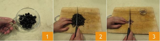 Para la preparación de la pasta con tapenade y caballa, comienza con la preparación de la tapenade. Deshuesa las aceitunas 1 y pícalas finamente con un cuchillo 2. Luego escurre las anchoas del aceite de conservación y pícalas también 3.