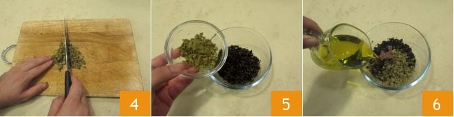 Finalmente, enjuaga las alcaparras suavemente bajo agua corriente, luego sécalas con un papel de cocina y pícalas finamente 4. Los ingredientes para preparar la tapenade están listos: vierte en un bol las aceitunas, las alcaparras 5, las anchoas y agrega el aceite 6.