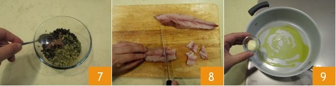 Mezcla bien los ingredientes 7, hasta obtener una mezcla homogénea. En este punto, tu tapenade estará lista, resérvala y dedícate a la preparación de la caballa. Toma los filetes de pescado y córtalos en trozos de aproximadamente 1,5 cm 8. Vierte un chorrito de aceite en una sartén antiadherente y dora un diente de ajo 9.