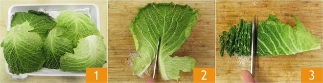 Para preparar la pasta con tocino, col y patatas, primero deshoje la col quitando las hojas exteriores más duras, lávelas bajo agua corriente y séquelas con un paño de cocina 1. Elimine la nervadura central 2 y corte las hojas en tiras de aproximadamente 1 cm 3. Reserve 50 g para la decoración.