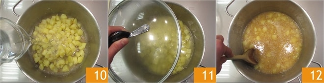 En este punto, cubra con agua al ras 10, baje el fuego y cocine durante 10 minutos con la tapa 11. Cuando las patatas estén casi cocidas, aplástelas ligeramente con el dorso de una cuchara 12.