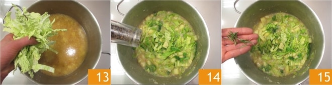 Ahora agregue la col 13, sal, pimienta 14 y perfume con el romero 15.