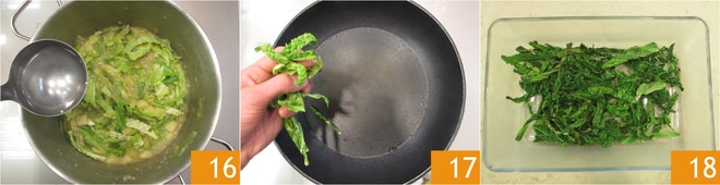Agregue aproximadamente 500 g de agua 16 y cocine durante otros 10 minutos. Lleve a ebullición una olla de agua que utilizará más adelante. Mientras tanto, saltee los 50 g de col en una sartén antiadherente con un poco de aceite 17 hasta que estén crujientes, luego resérvelos 18.