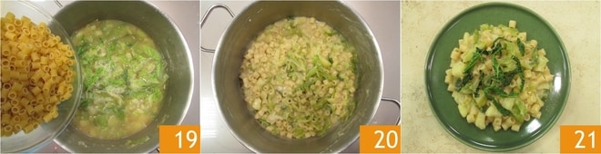 Transcurrido el tiempo de cocción de la col y las patatas, agregue la pasta 19 y cocínela añadiendo un cucharón de agua hirviendo a la vez, como un risotto. Cuando la pasta esté cocida, apague el fuego y ajuste de sal y pimienta, luego mezcle con el queso rallado y remueva bien 20. Complete con la col crujiente y sirva su pasta con tocino, col y patatas bien caliente 21!
