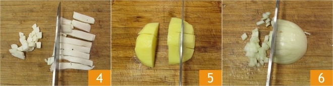 Corte el tocino en cubos 4, luego pele las patatas y córtelas también en cubos de 1 cm 5. Finalmente, pele la cebolla y píquela finamente 6