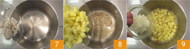 Vierta el tocino en una olla grande 7 y déjelo derretir completamente, luego agregue las patatas 8. Después de dorar las patatas, agregue las cebollas 9 y mezcle durante unos minutos.